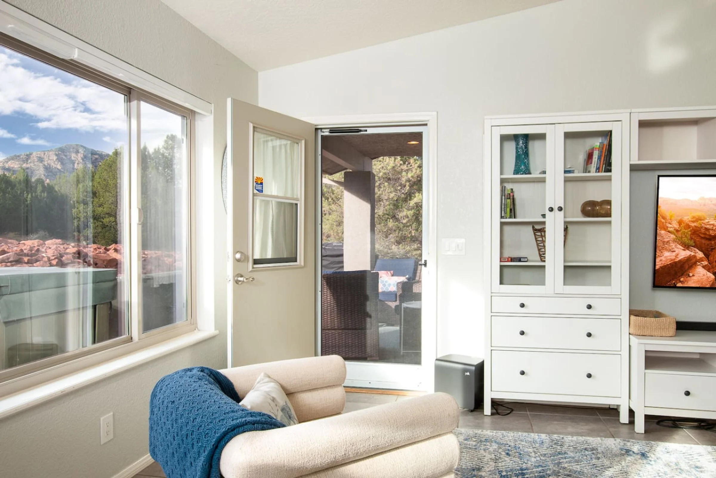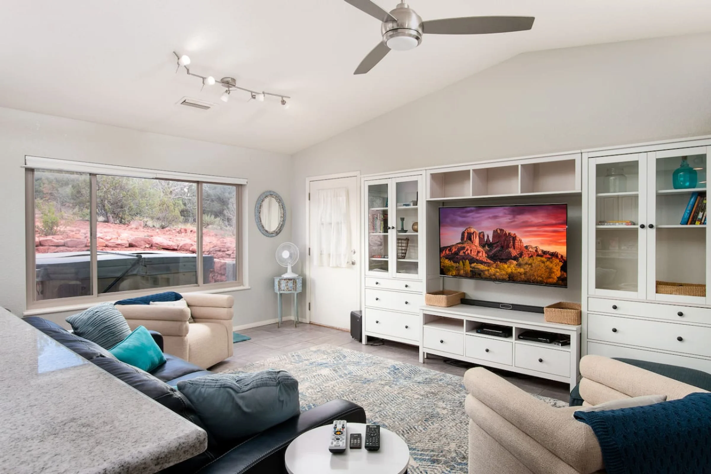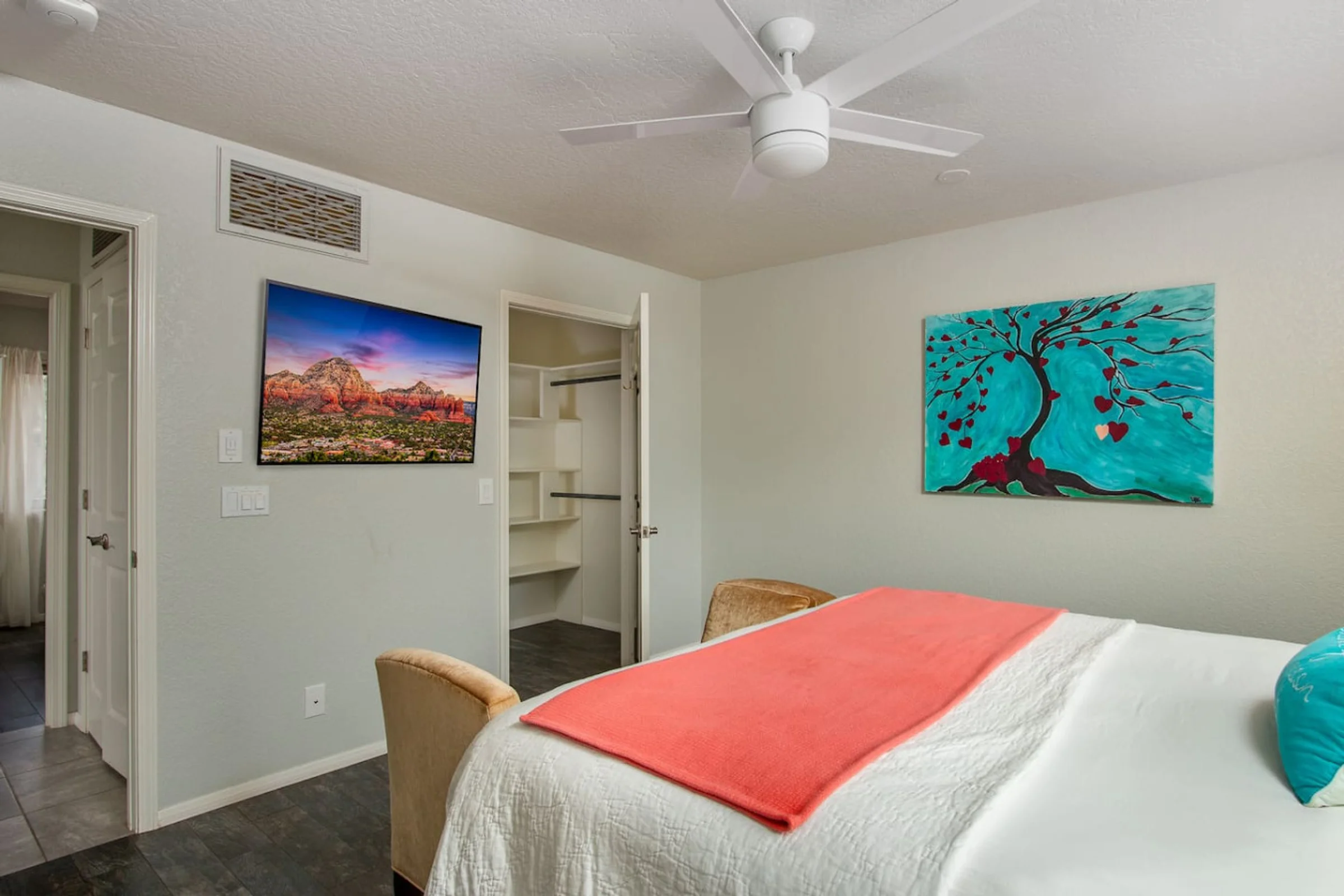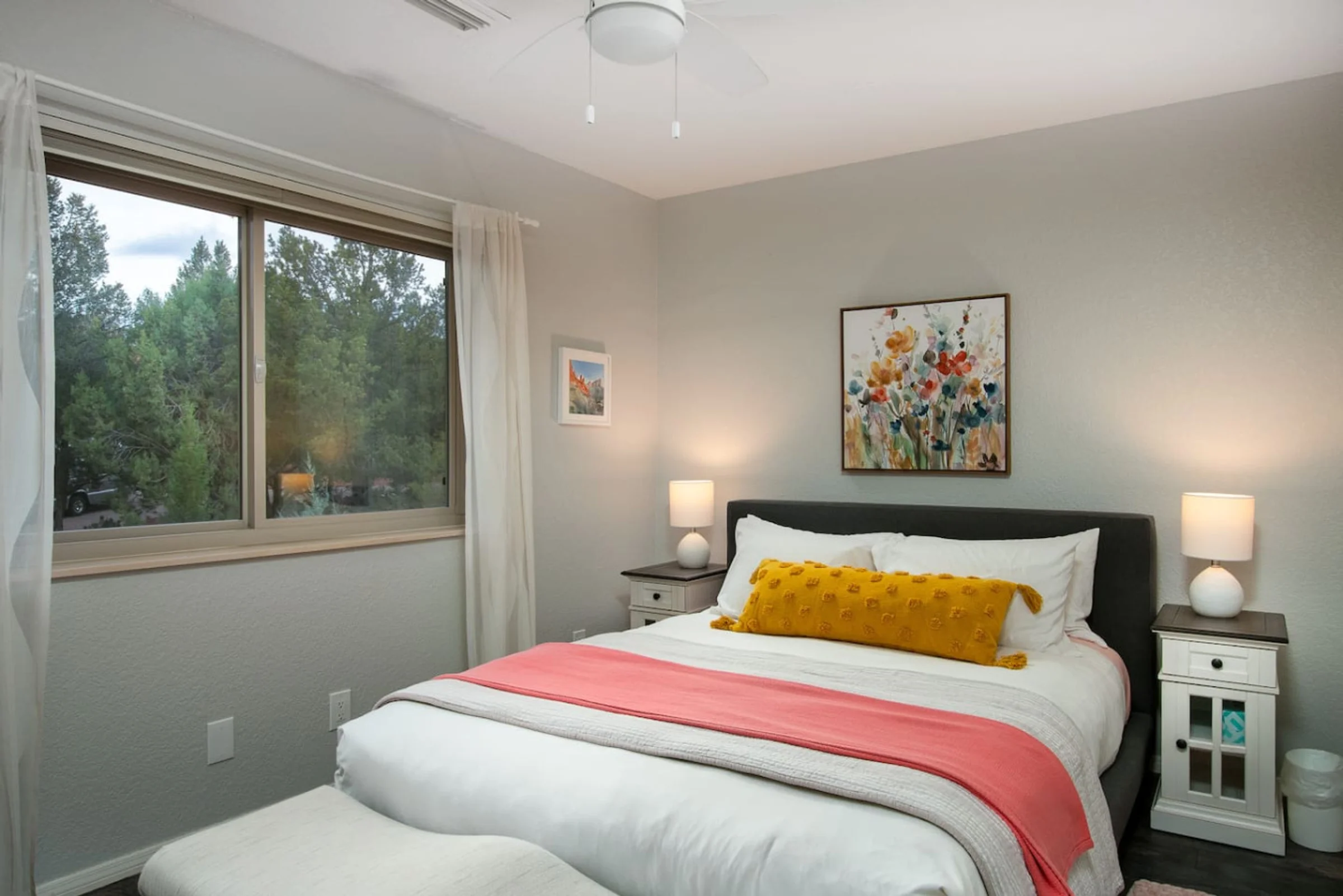 Two bedrooms (California King and Queen), a sleeper sofa that makes it a six-sleeper for small families, a fully-equipped kitchen, in-unit laundry, and a dedicated spot for bikes. West Sedona keeps you close to everything — Whole Foods at three miles, Dry Creek trailhead at six minutes, Cathedral Rock at fifteen.