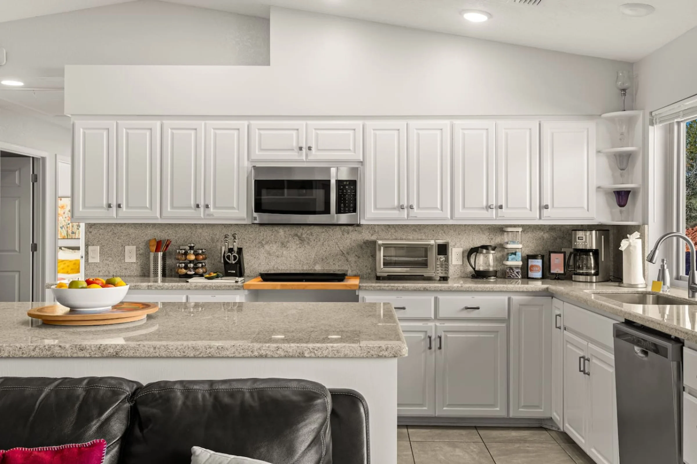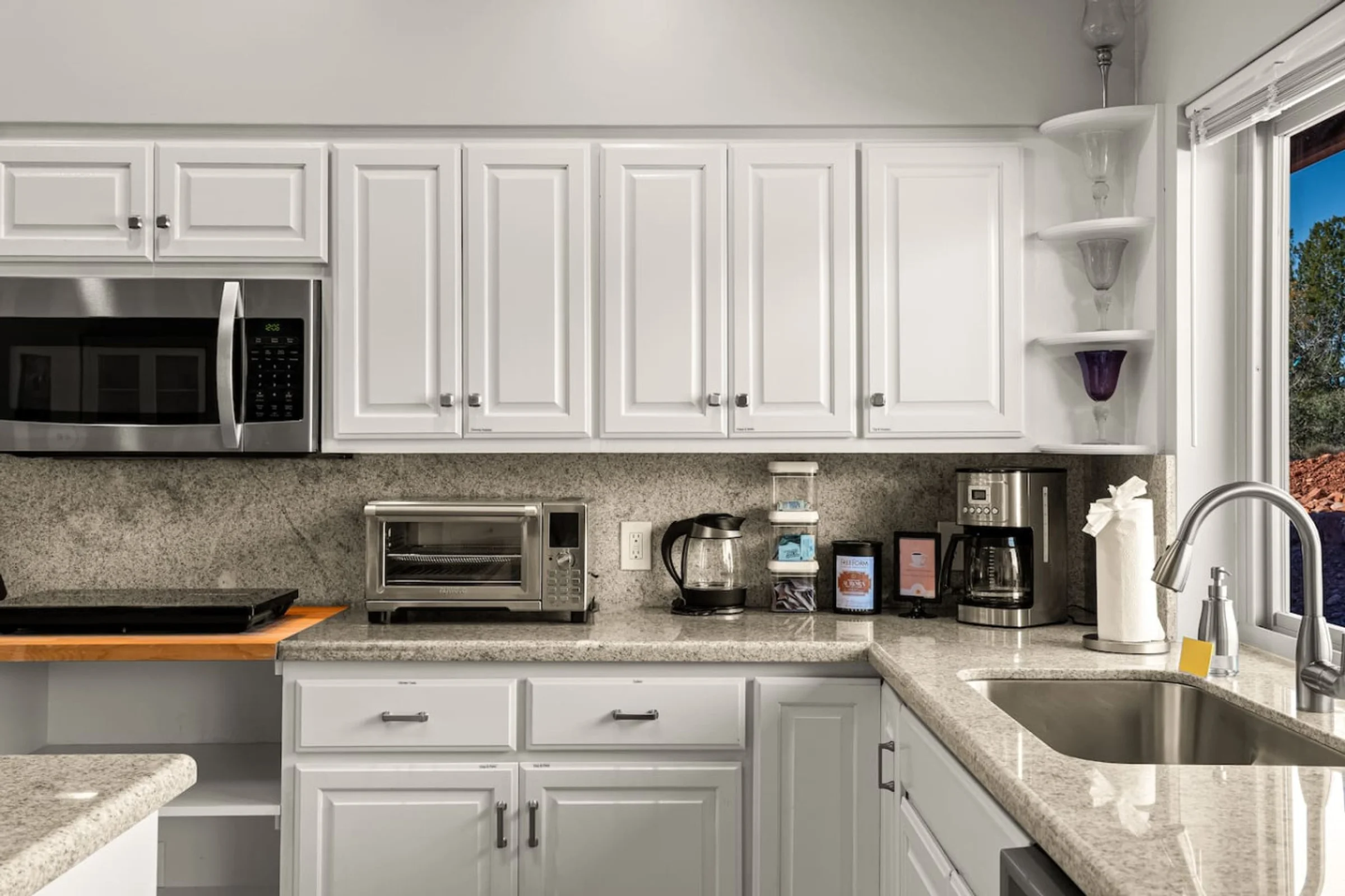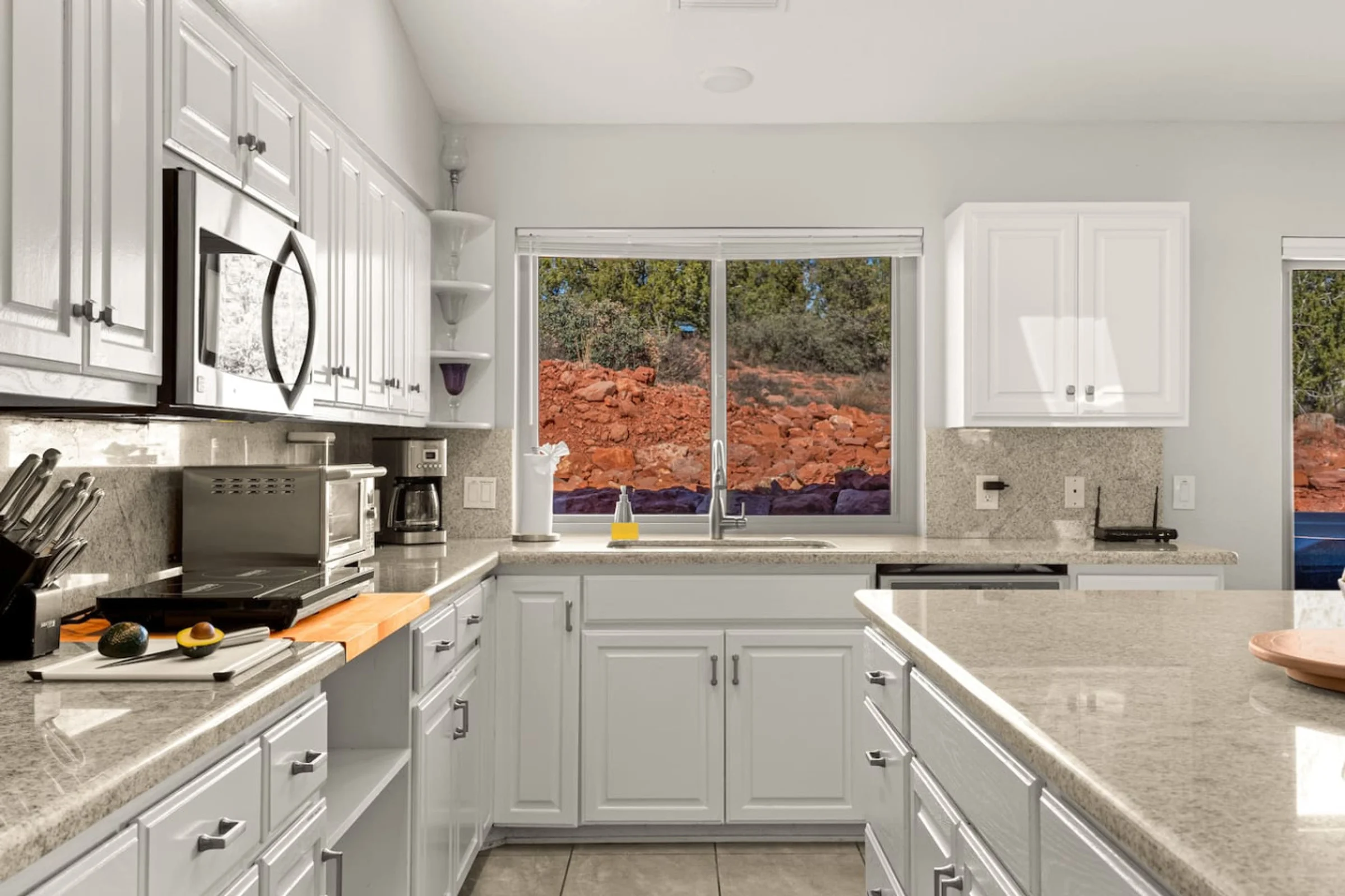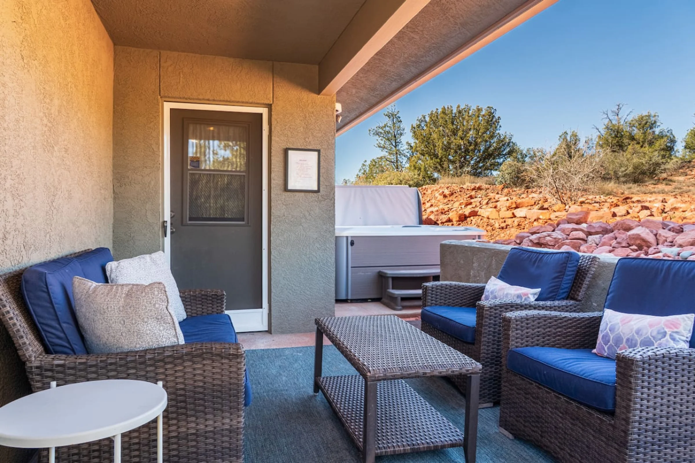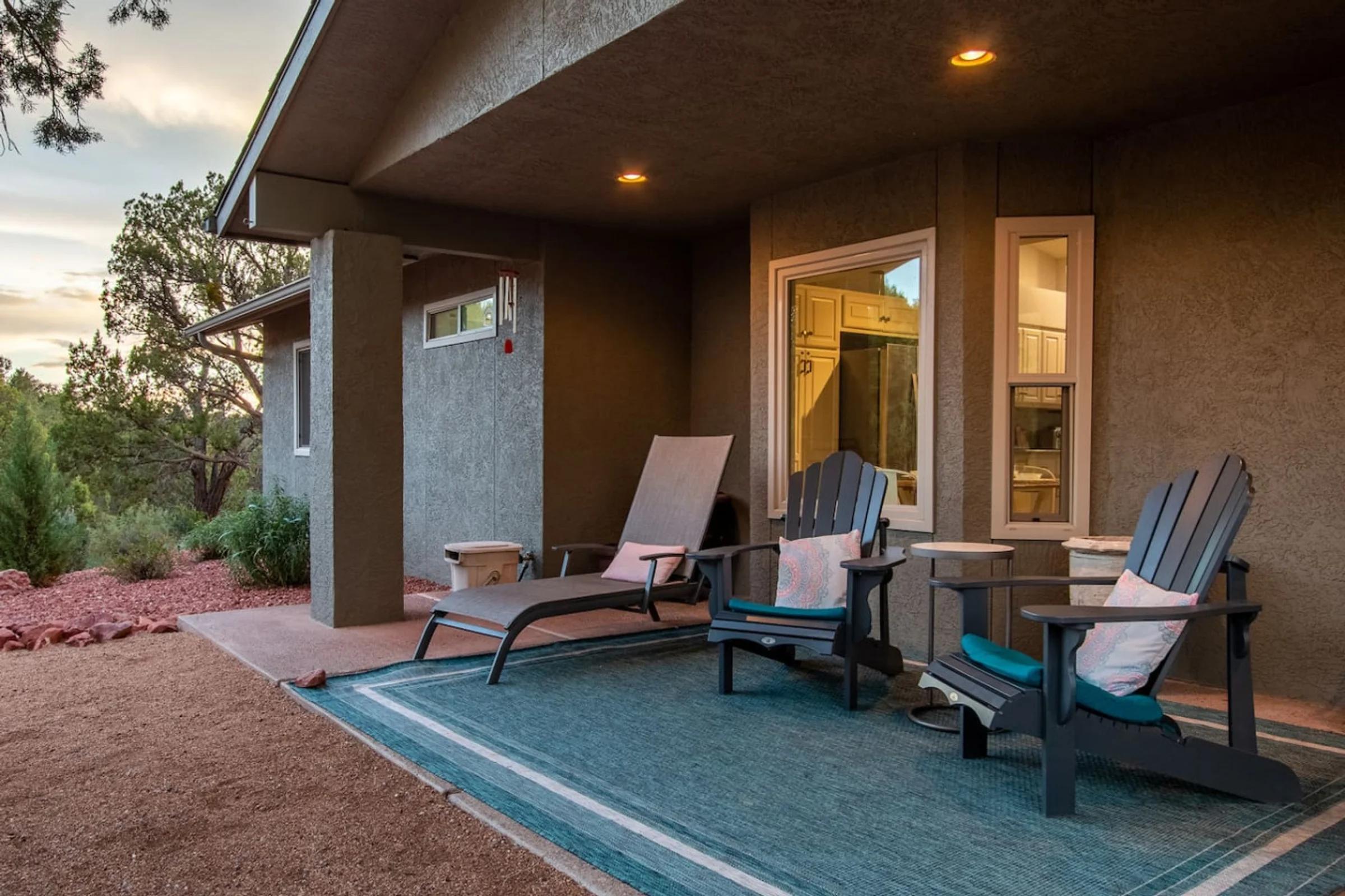 Two bedrooms (California King and Queen), a sleeper sofa that makes it a six-sleeper for small families, a fully-equipped kitchen, in-unit laundry, and a dedicated spot for bikes. West Sedona keeps you close to everything — Whole Foods at three miles, Dry Creek trailhead at six minutes, Cathedral Rock at fifteen.
