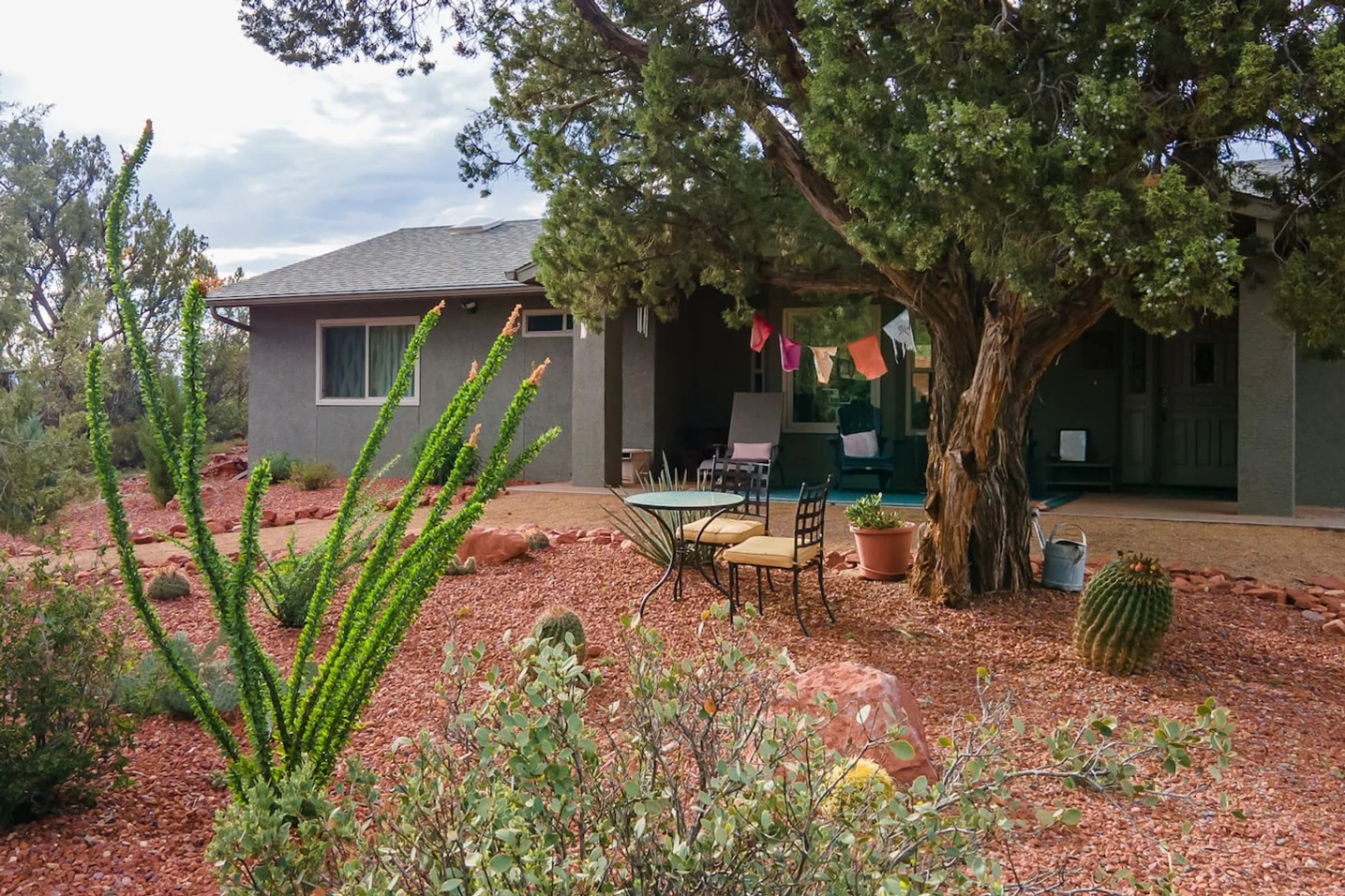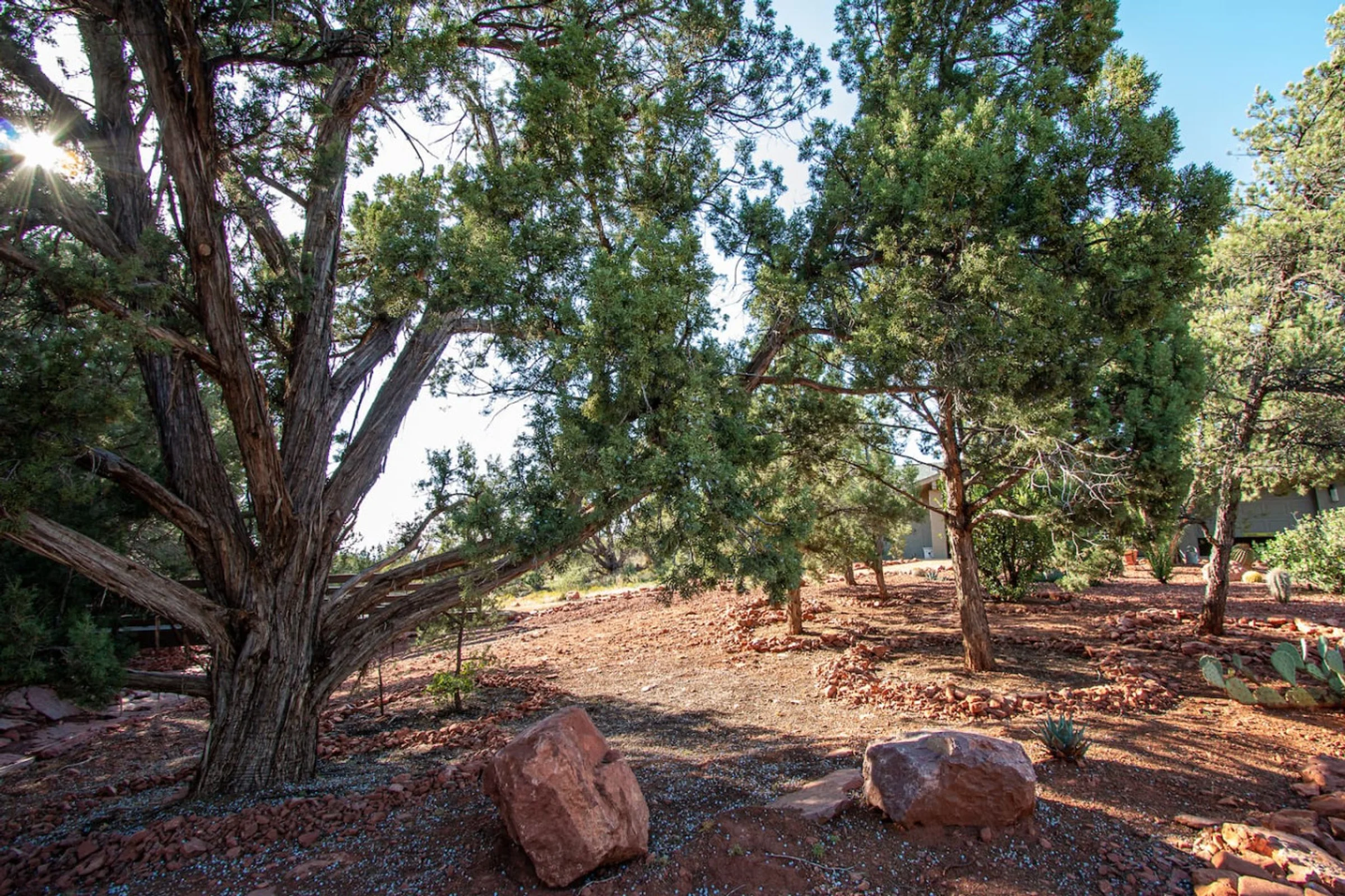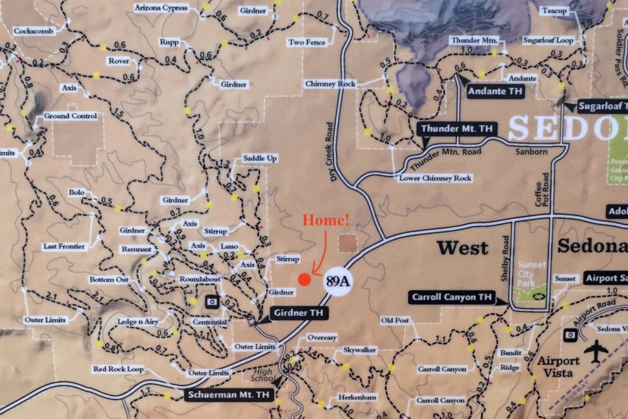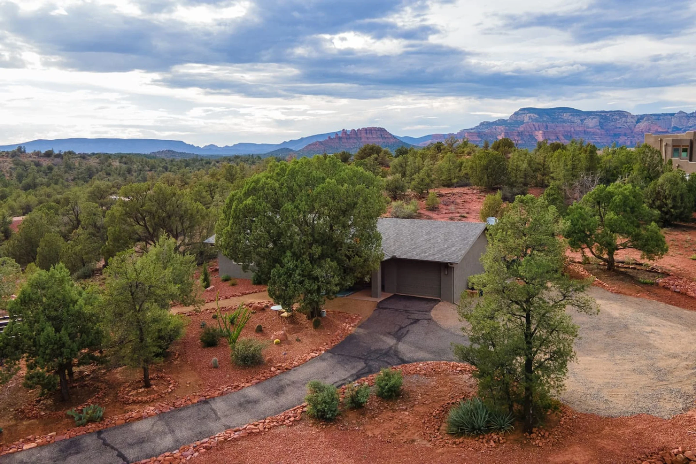West Sedona, tucked against forest land. Quieter than Uptown but still minutes from everything that pulls people to Sedona. The property's back boundary is national forest, which keeps the setting honest and the hikes short.