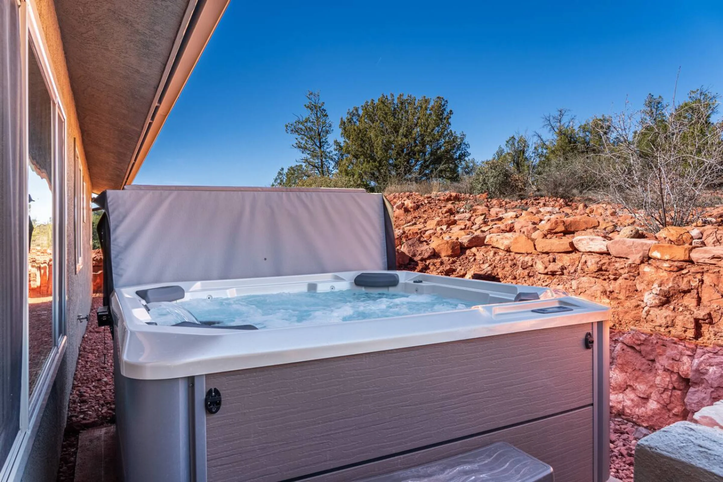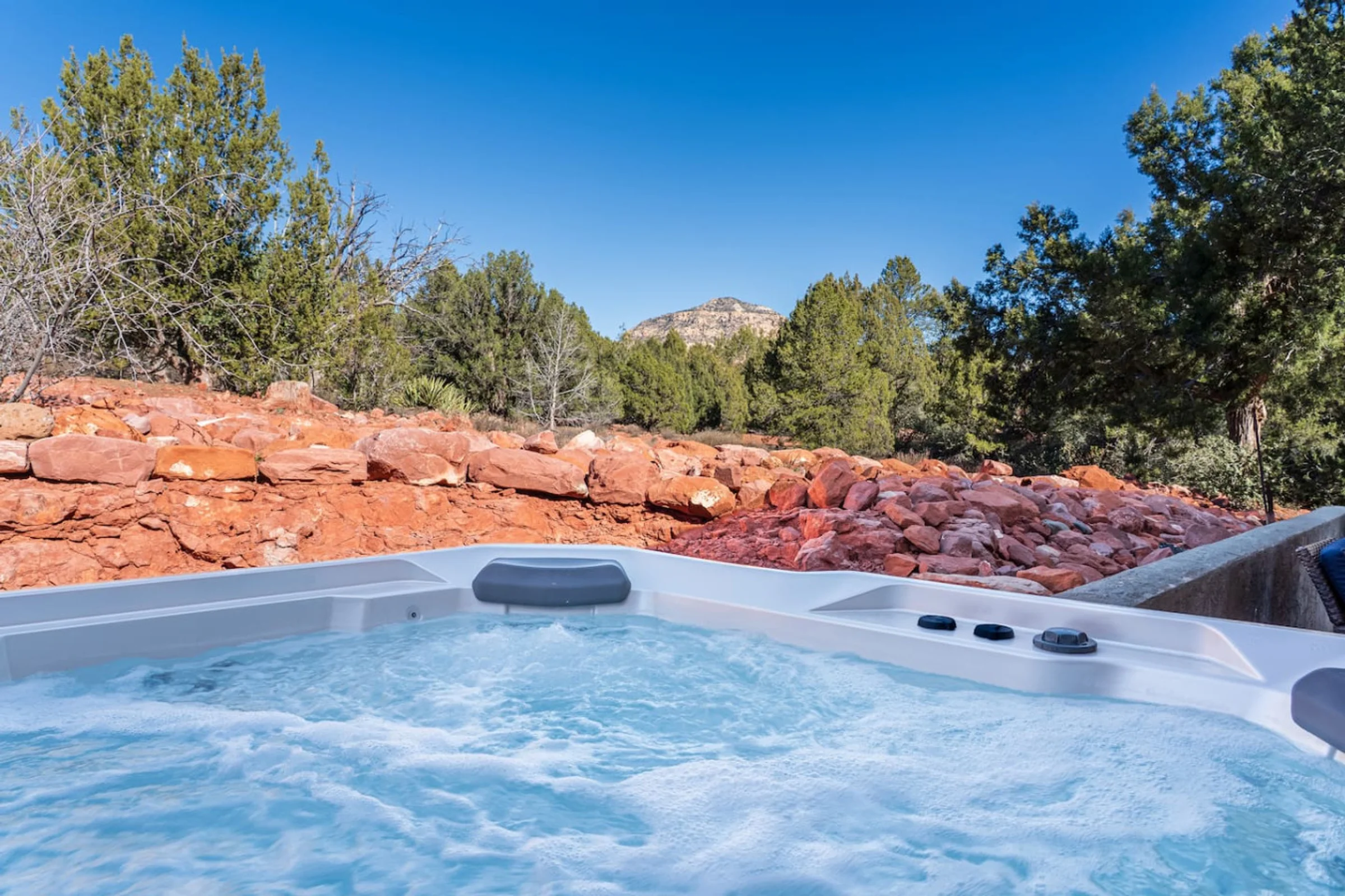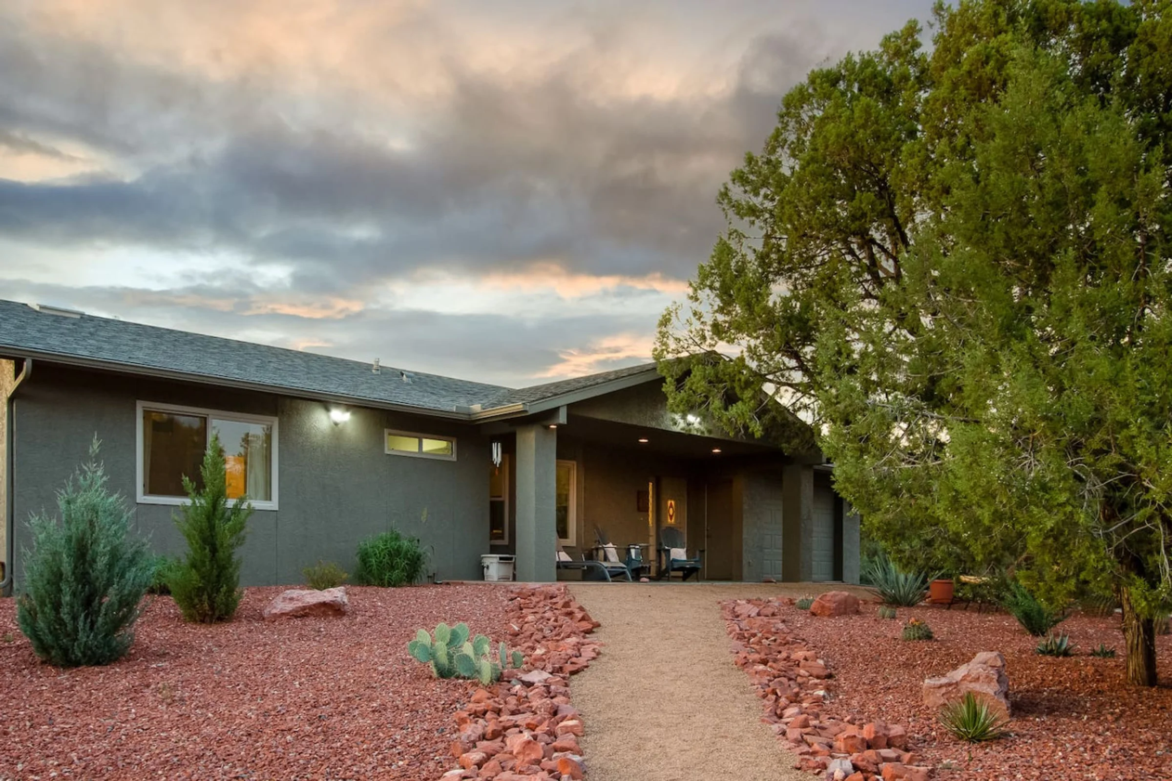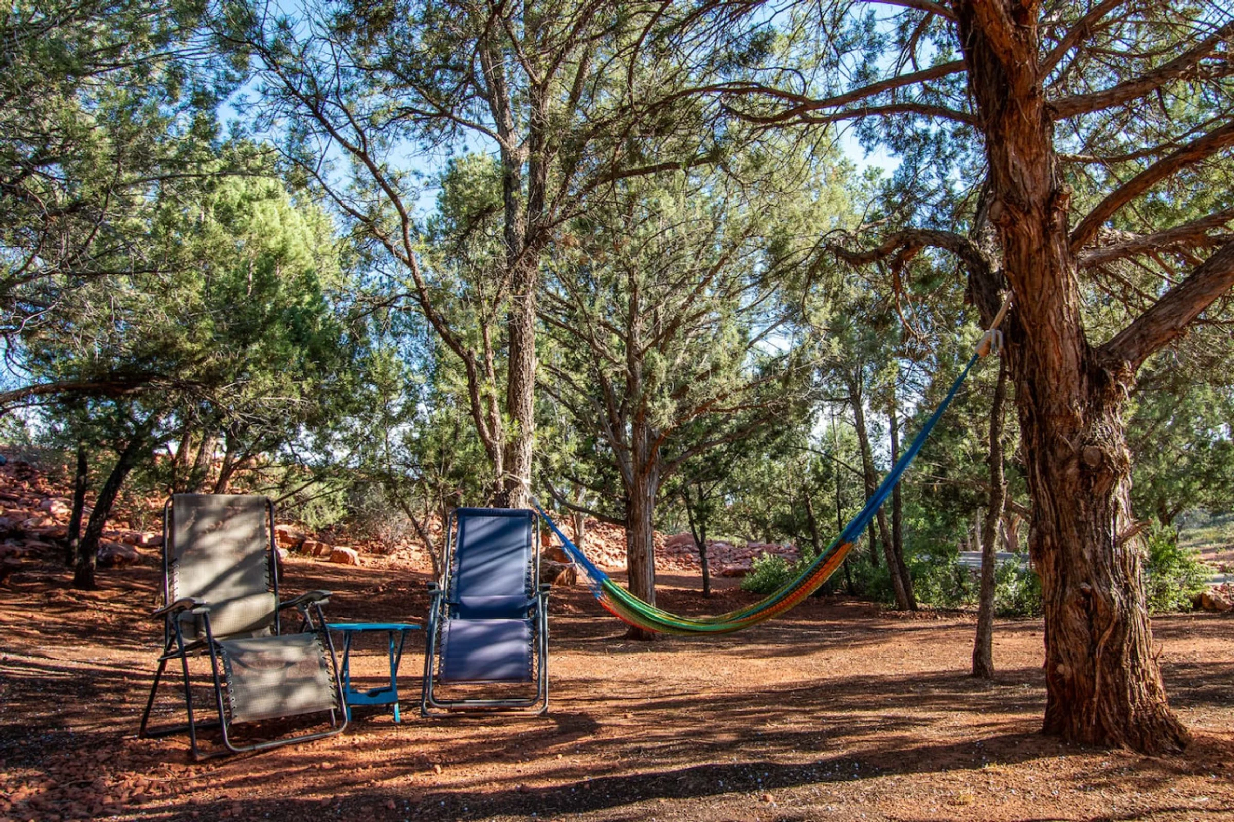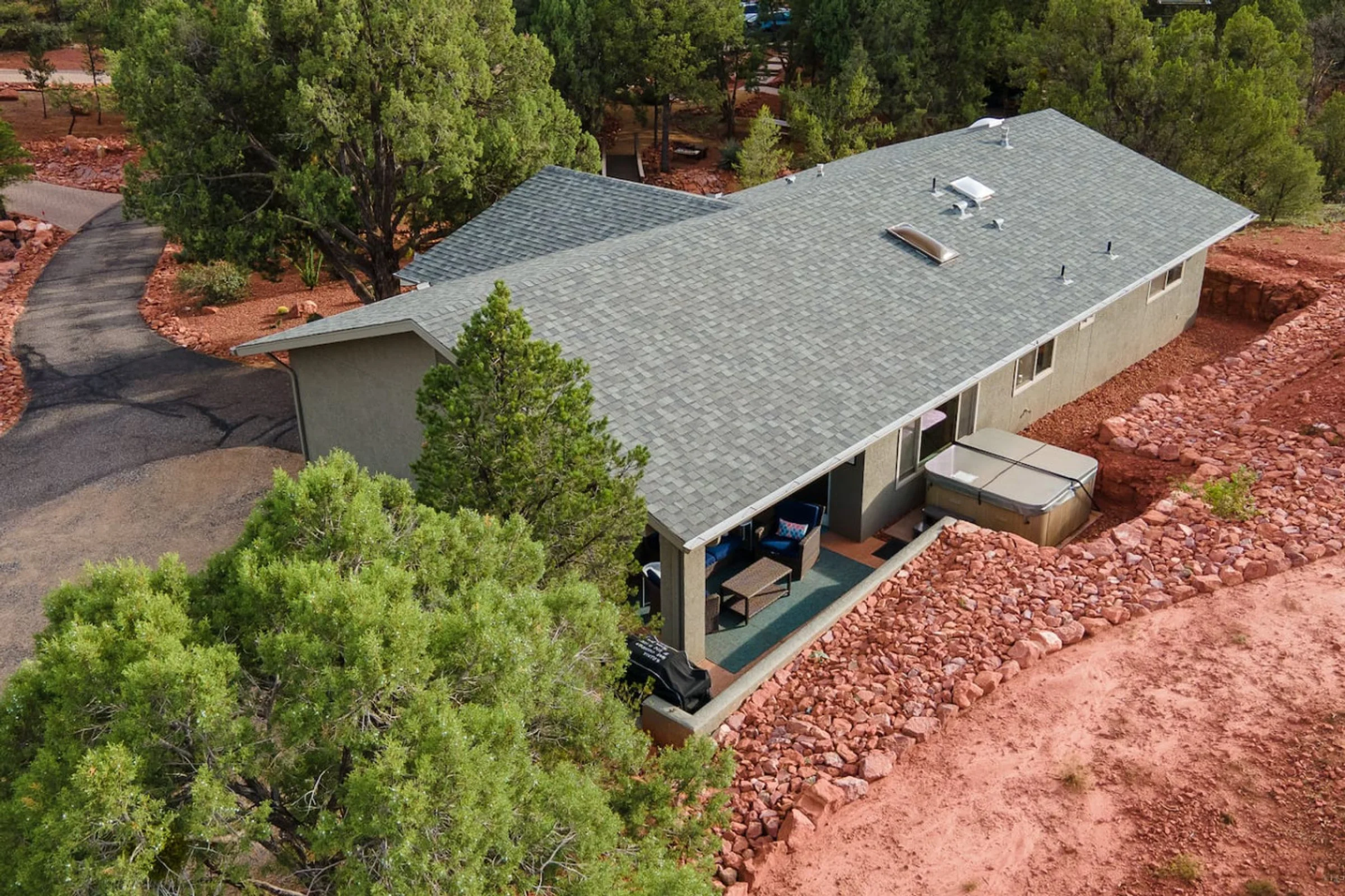 West Sedona, tucked against forest land. Quieter than Uptown but still minutes from everything that pulls people to Sedona. The property's back boundary is national forest, which keeps the setting honest and the hikes short.
